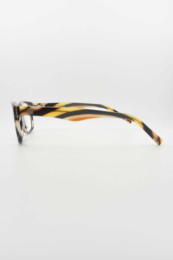 - Oval eyeglasses with a sleek brushed grey finish and unique multicolor temples, combining sophistication with a playful edge.