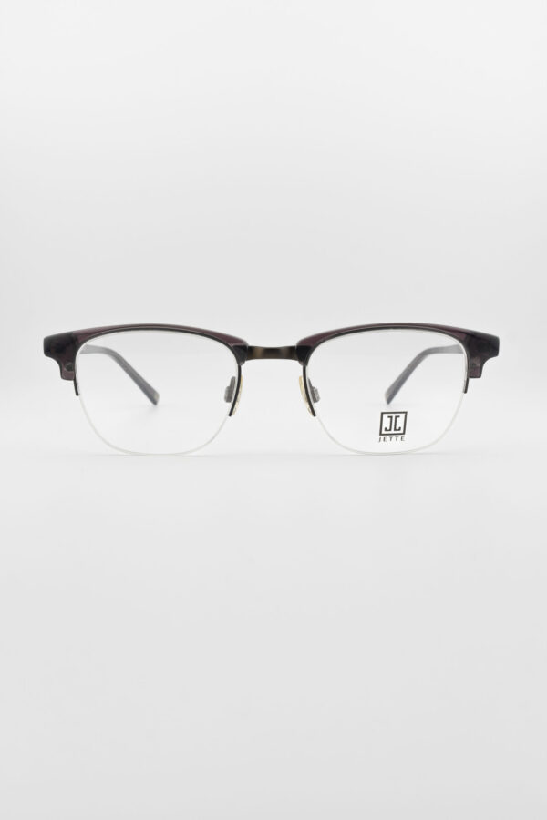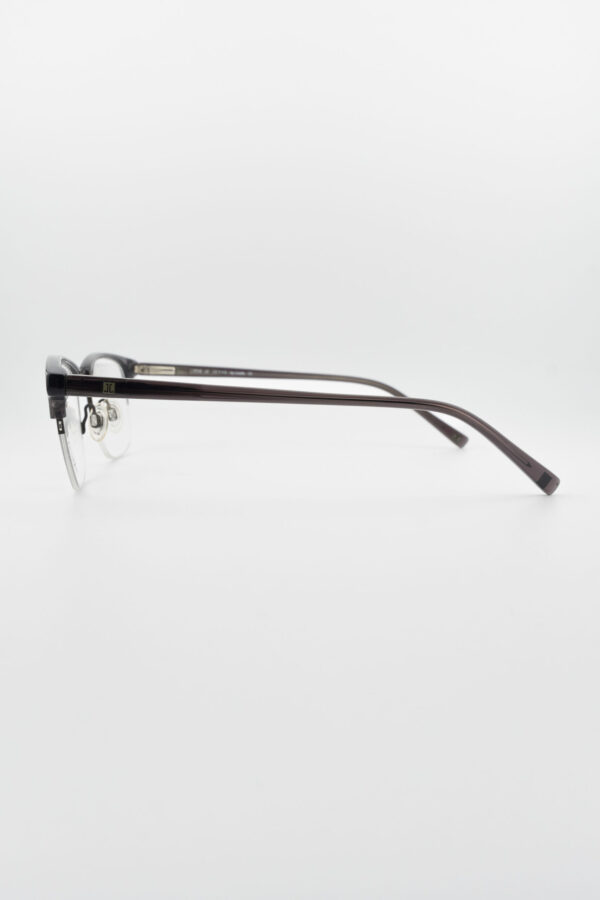 - Sophisticated semi-rimless eyeglasses with a deep burgundy frame, exuding elegance and modern charm.