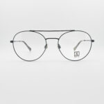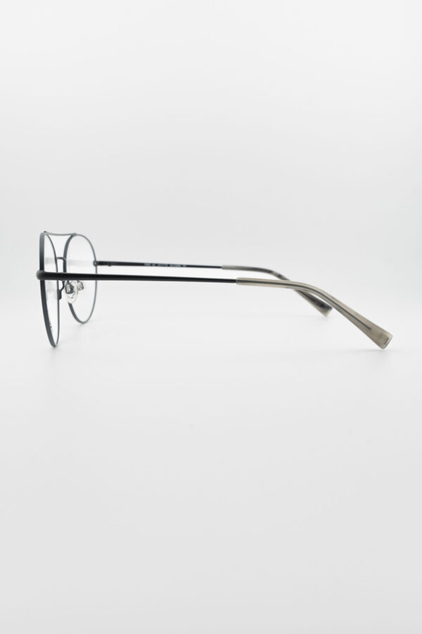 - Bold black metal aviator-style eyeglasses frame with a unique double bridge for a contemporary and striking look.