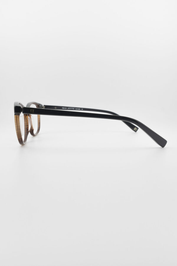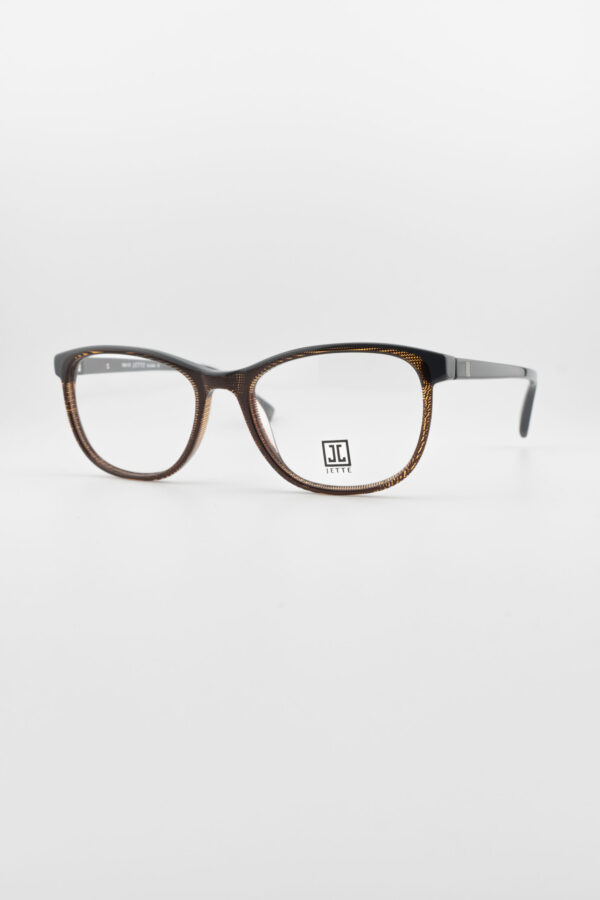 - Brown and black oval eyeglasses with intricate textured detailing on the front for a unique touch.