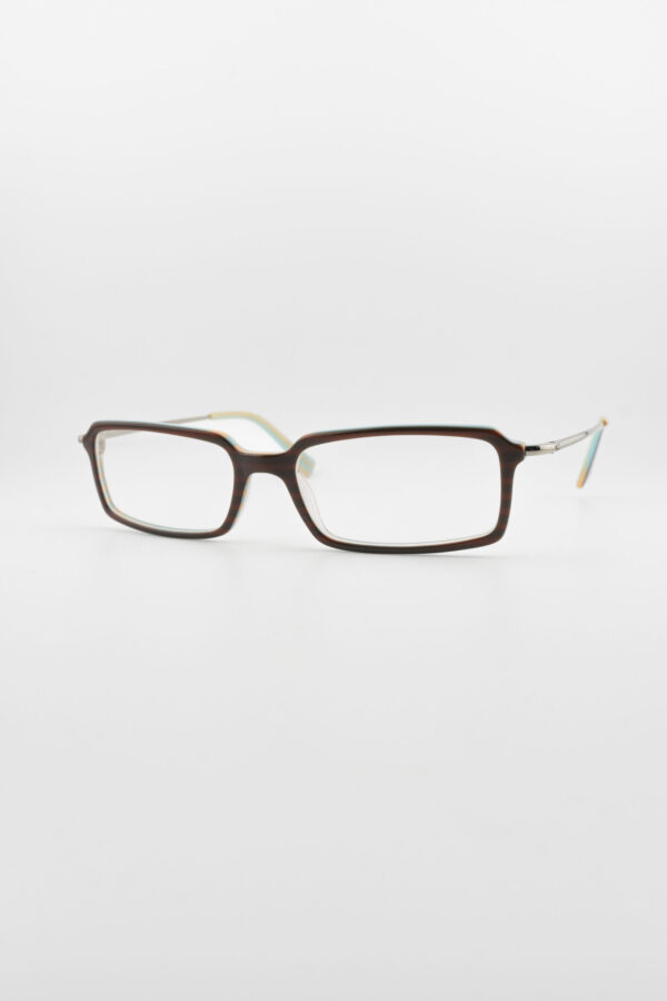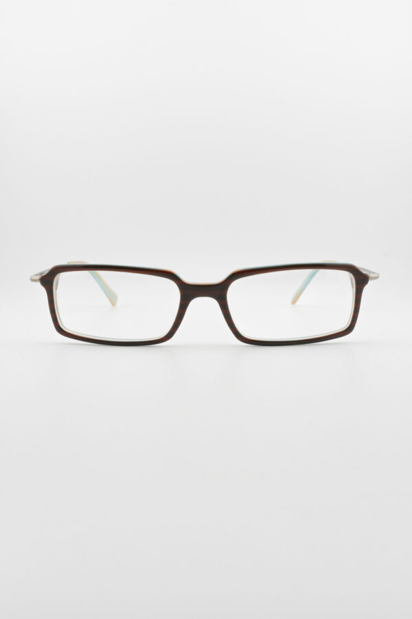 Ces montures présentent une face aux nuances chaudes inspirées de l’écaille de tortue, associée à des branches métalliques élégantes. Les embouts des branches arborent un accent aqua inattendu, ajoutant une touche ludique mais sophistiquée. Parfaites pour les environnements professionnels et décontractés, ces lunettes équilibrent idéalement design intemporel et moderne.